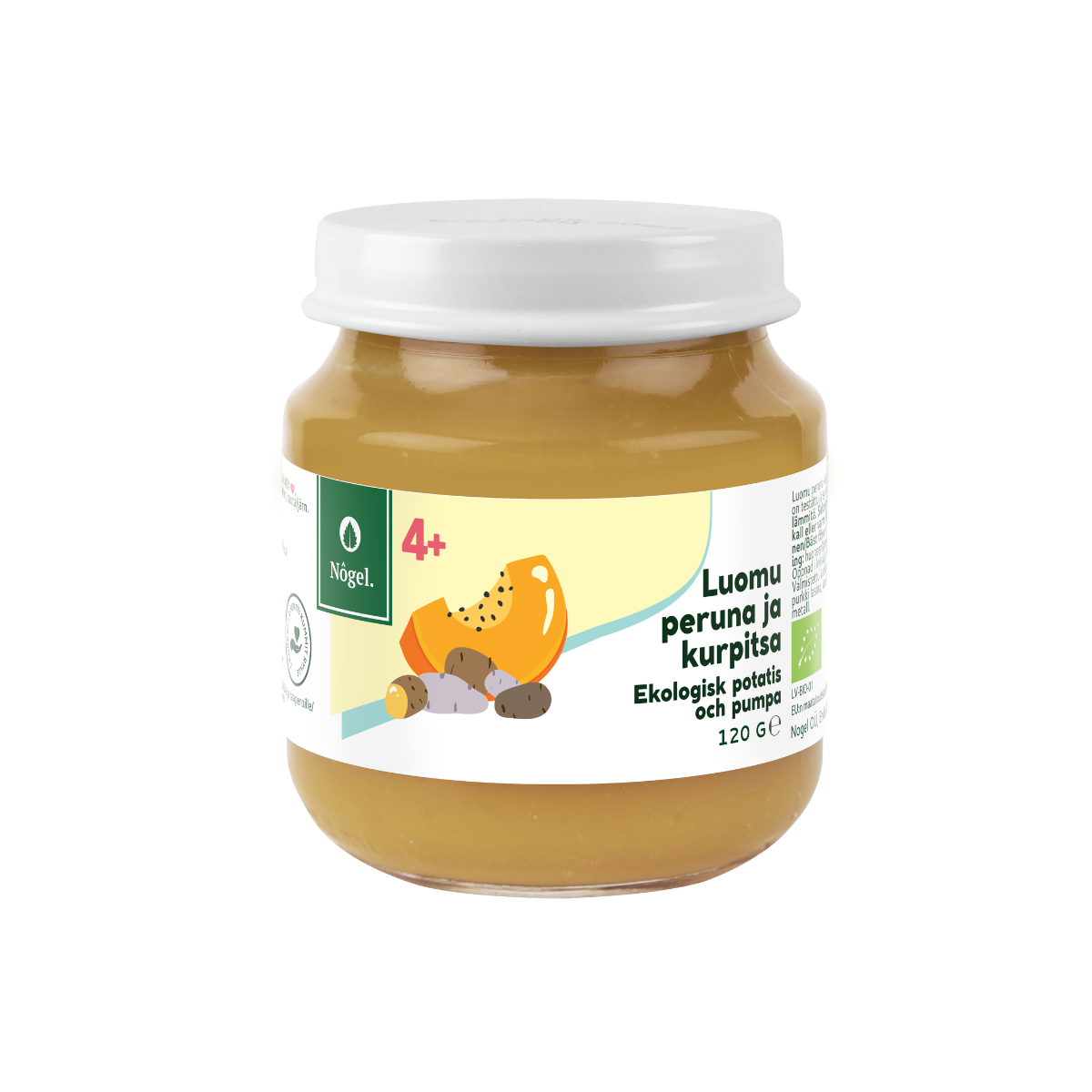 Nôgelin perunasose kurpitsalla on erinomainen vihannessose kiinteitä aloittaessa. Tarkistettu nitraattipitoisuus, sopii 4+ kk ruokavalioon.